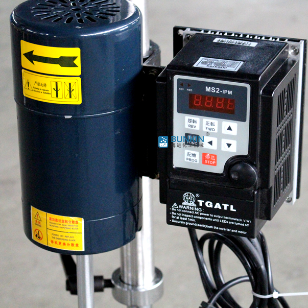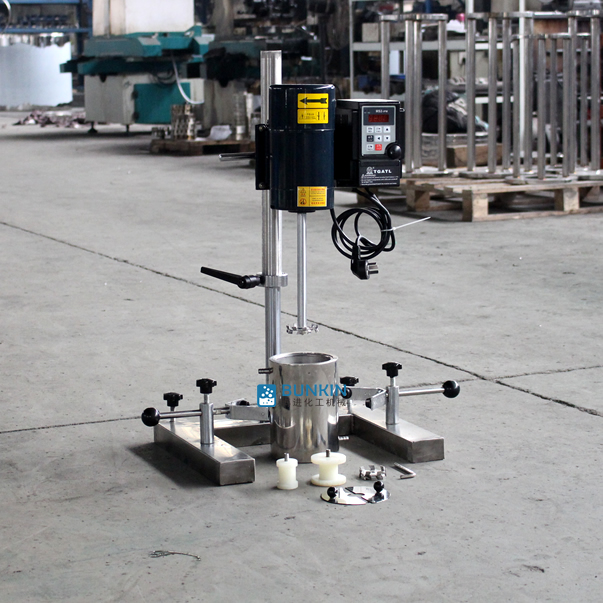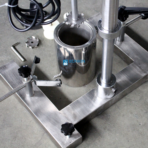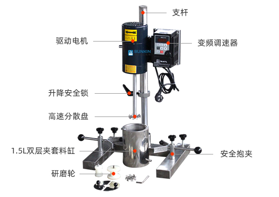 設備帶有鎖緊及升降手柄,能夠快速升降和固定;分散盤采用內六角螺栓與主軸固定,能夠方便快速拆卸更換,清洗容易;帶有夾桶裝置,可以快速將攪拌桶固定,防止桶在工作中發生位移造成安全事故。
