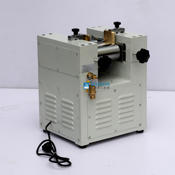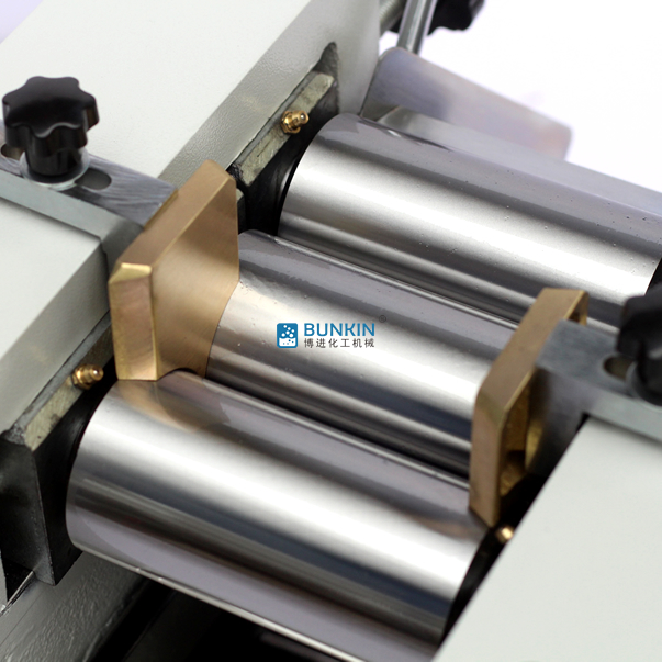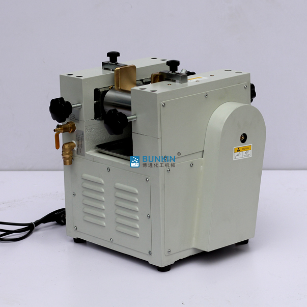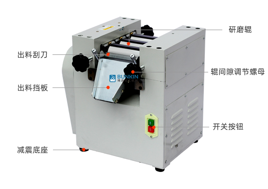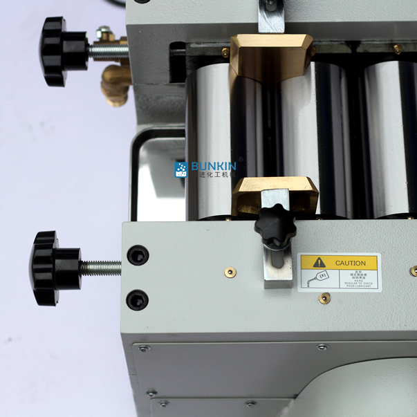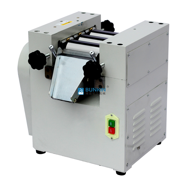實驗室三輥研磨機由三個輥筒組成,裝在一個機架上,由電動機直接帶動。一般輥筒間的轉動方向不同,前輥向前轉動,中輥向后轉動。輥子轉速前輥快、后輥慢。中間輥固定,前后兩輥裝在滑道上,有彈簧裝置,用手輪調節前后輥與中輥的距離。物料由后輥與中輥之間進入,受到輥筒的擠壓,產品顆粒變細,然后由快輥帶出,快輥末端裝有刮刀,使物料與輥筒分離,落入收集桶內。