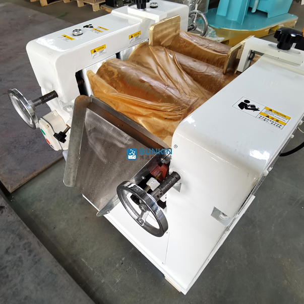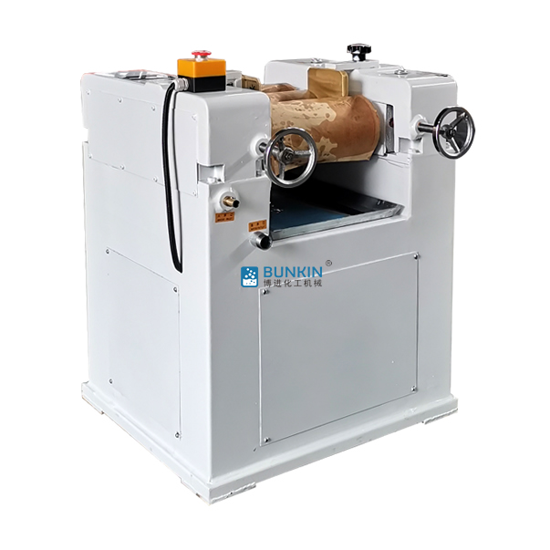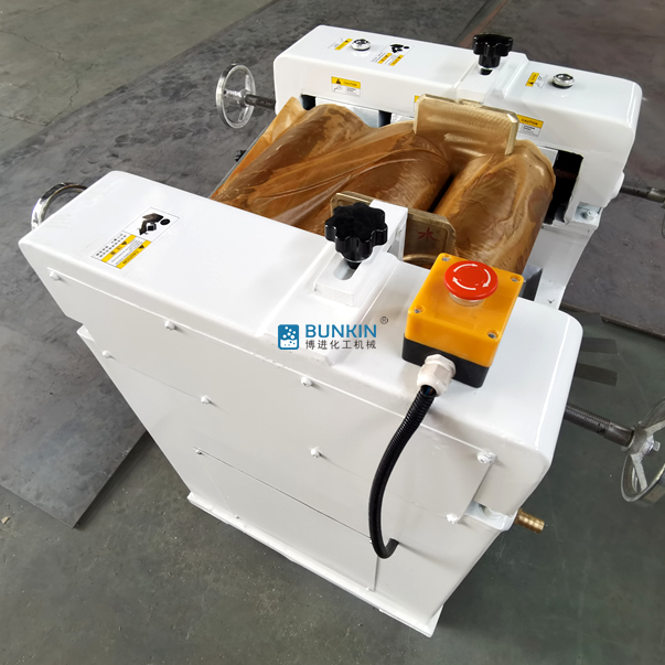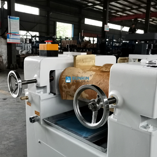 三輥研磨機由三個輥筒組成,裝在一個機架上,由電動機直接帶動。一般輥筒間的轉動方向不同,前輥向前轉動,中輥向后轉動。輥子轉速前輥快、后輥慢。中間輥固定,前后兩輥裝在滑道上,有彈簧裝置,用手輪調節(jié)前后輥與中輥的距離。物料由后輥與中輥之間進入,受到輥筒的擠壓,產品顆粒變細,然后由快輥帶出,快輥末端裝有刮刀,使物料與輥筒分離,落入收集桶內。