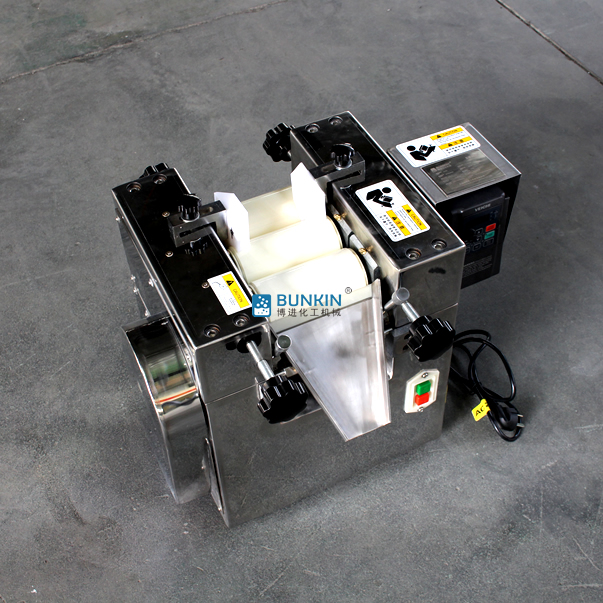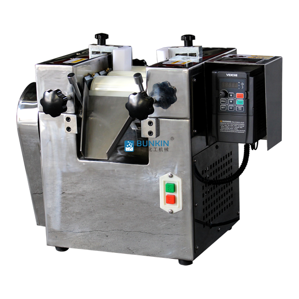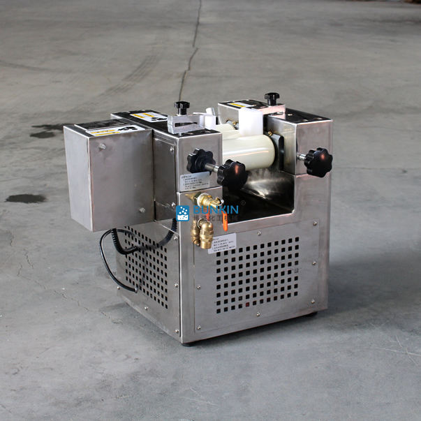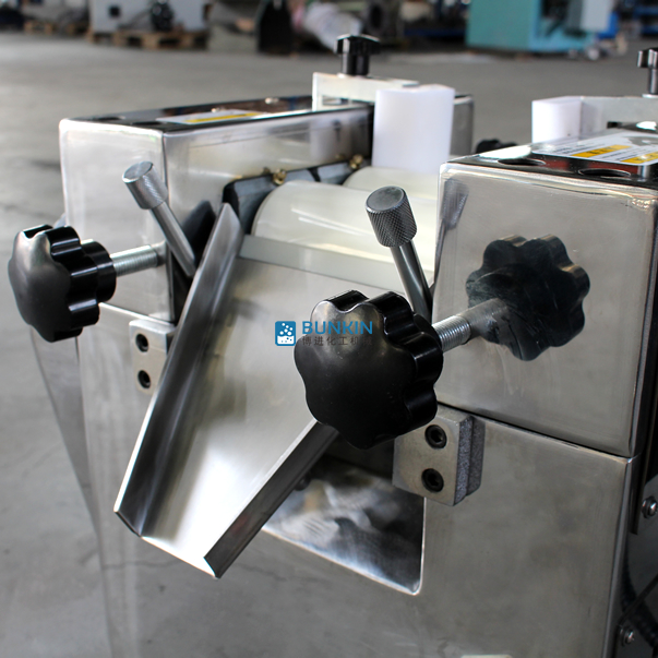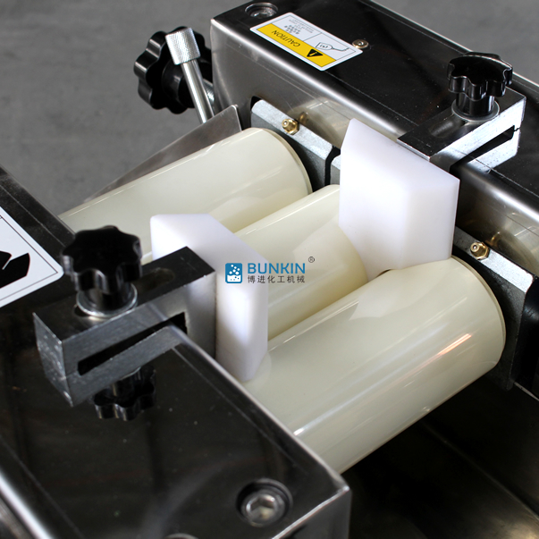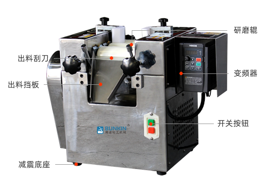 實驗室三輥研磨機由三個輥筒組成,裝在一個機架上,由電動機直接帶動。一般輥筒間的轉動方向不同,前輥向前轉動,中輥向后轉動。輥子轉速前輥快、后輥慢。中間輥固定,前后兩輥裝在滑道上,有彈簧裝置,用手輪調節前后輥與中輥的距離。物料由后輥與中輥之間進入,受到輥筒的擠壓,產品顆粒變細,然后由快輥帶出,快輥末端裝有刮刀,使物料與輥筒分離,落入收集桶內。