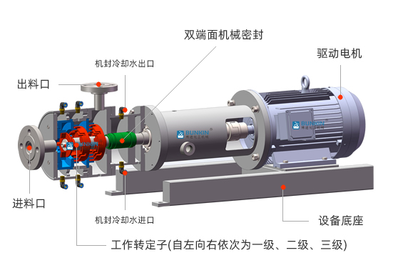 管線式三級(jí)乳化泵采用臥式結(jié)構(gòu)。在狹長(zhǎng)的工作腔內(nèi)裝有三組轉(zhuǎn)定子,轉(zhuǎn)定子可設(shè)計(jì)成三級(jí)十二層、三級(jí)十四層、三級(jí)十八層或者其它非標(biāo)結(jié)構(gòu)形式,轉(zhuǎn)定子對(duì)偶耦合,高度配合。由電機(jī)帶動(dòng)中間軸進(jìn)行高速運(yùn)轉(zhuǎn),轉(zhuǎn)定子形成真空,物料從進(jìn)口被吸入轉(zhuǎn)定子腔內(nèi),強(qiáng)大動(dòng)能使轉(zhuǎn)子產(chǎn)生極高的線速度,使物料在轉(zhuǎn)、定子間隙之間經(jīng)過強(qiáng)烈的撞擊、破碎、離心擠、液層摩擦、強(qiáng)力剪切之后飛射出去,在多種不同方向力的作用下,產(chǎn)生強(qiáng)大紊流,物料從出口流出。