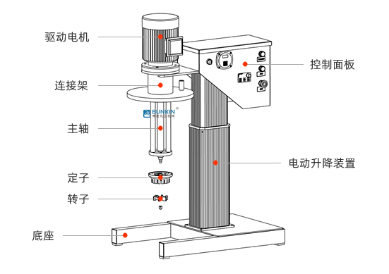 實(shí)驗(yàn)室電動升降乳化機(jī)強(qiáng)勁的馬達(dá)進(jìn)行高速旋轉(zhuǎn)使轉(zhuǎn)、定子之間形成真空,物料從轉(zhuǎn)、定子上部和底部吸入。大動能使轉(zhuǎn)子產(chǎn)生極高的線速度,使物料在轉(zhuǎn)、定子間隙之間經(jīng)過強(qiáng)烈的撞擊、破碎、離心擠、液層摩擦、強(qiáng)力剪切之后飛射出去,在多種不同方向力的作用下,產(chǎn)生強(qiáng)大紊流。物料在適量乳化劑和成熟工藝下經(jīng)過一定時間反復(fù)循環(huán)解聚、分散、均質(zhì)、細(xì)化、剪切產(chǎn)生穩(wěn)定乳狀液。