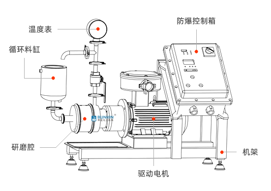 所配料桶及研磨腔體帶冷卻水夾套,在設備運行時通水冷卻,起到很好的冷卻效果,常規溫升小于10º。