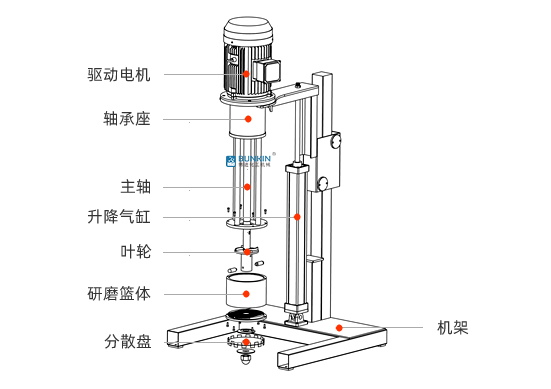 氣動升降籃式研磨機電機運轉帶動撥桿和底部分散盤高速旋轉,使分散盤上部及籃腔內部形成真空,漿料被吸入籃式研磨腔內。撥桿驅動腔內的研磨介質產生向各個方向的力,物料中的顆粒受到介質不斷地碰撞及摩擦,粒徑變小,粒徑范圍變窄;分散盤的高速運轉,產生渦流將腔內物料抽吸出來,再循環至進料,具有非常顯著的分散研磨混合效果, 通過氣閥旋轉或電磁閥點動控制實現氣缸工作,利用氣缸升降帶動電機及工作頭升降。