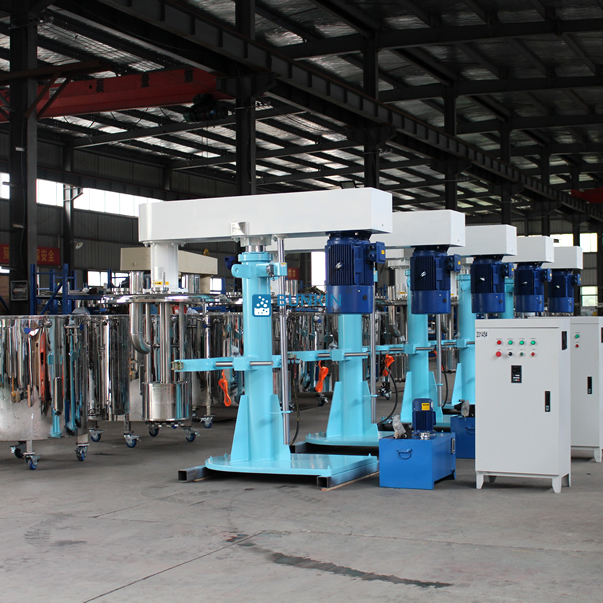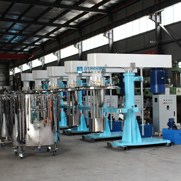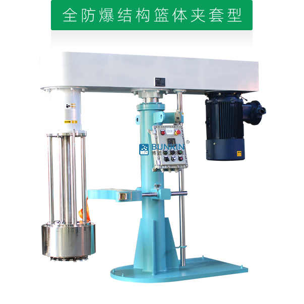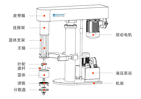 液壓升降籃式研磨機電機運轉帶動撥桿和底部分散盤高速旋轉,使分散盤上部及研磨腔內部形成真空,漿料被吸入籃式研磨腔內。撥桿驅動腔內的研磨介質產生向各個方向的力,物料中的顆粒受到介質不斷地碰撞及摩擦,粒徑變小,粒徑范圍變窄;分散盤的高速運轉,產生渦流將腔內物料抽吸出來,再循環至進料,具有非常顯著的分散混合效果,通過液壓泵工作驅動液壓柱塞升降,帶動整個傳動機構和研磨裝置升降。