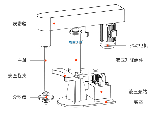 設備通過油缸作為升降執行器,帶控制閥控制分散機上升、停止、下降,操作簡單,穩定性高;分散盤采用內六角螺栓與主軸固定,能夠方便快速拆卸更換,清洗容易,且可以根據工藝情況更換不同的分散盤,實現分散效果;帶有不同的抱夾方式(皮帶、手搖、氣動),可以快速將攪拌桶固定,防止桶在工作中發生位移造成安全事故。