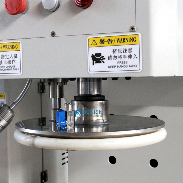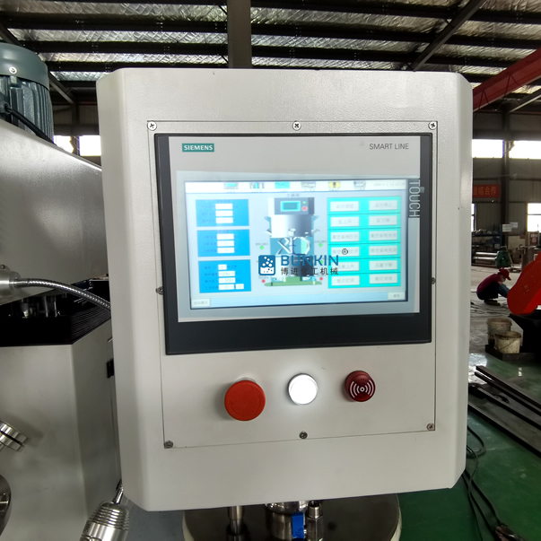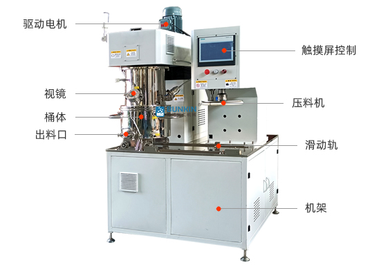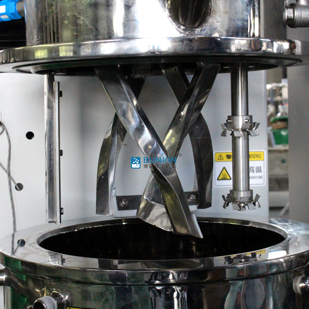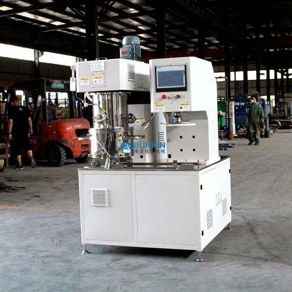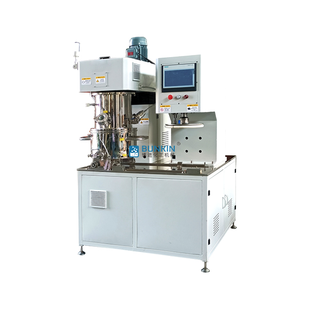 行星架轉動時,帶動箱內的兩個攪拌框及分散軸圍繞反應釜軸線公轉的同時高速自轉,從而使物料受到強烈的剪切、捍合作用,達到充分分散和混合的目的;在行星架上有一刮壁刀隨行星架轉動,緊貼桶壁不斷的刮拭,使桶壁無滯留料,提高混合效果。攪拌時間的長短根據物料的屬性的不同由用戶掌握,可通過控制面板調節。封蓋及行星攪拌器由液壓升降,操作平穩、快捷、輕便。