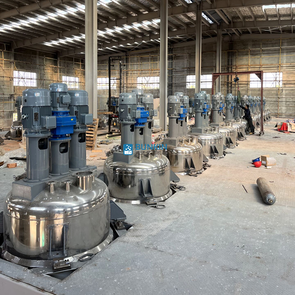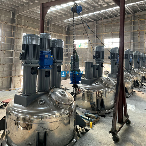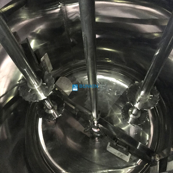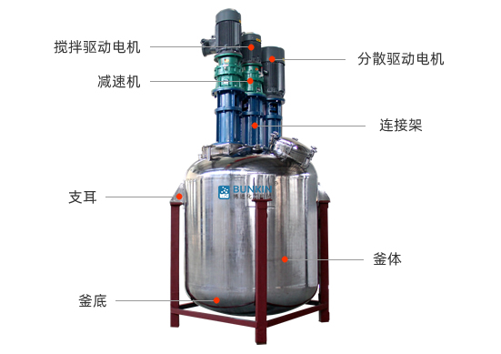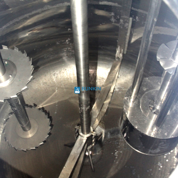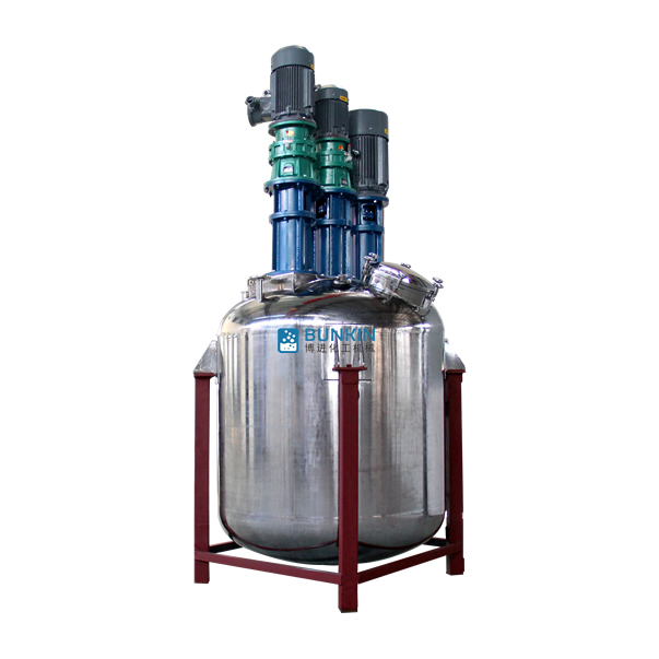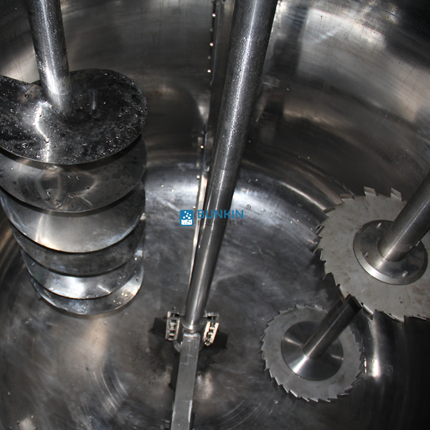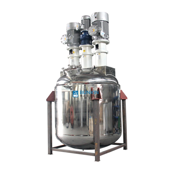 三軸多功能反應釜由帶刮壁式攪拌器和高速分散器(乳化頭或研磨頭)組成,三組攪拌器同時作業使物料受到強烈的分散、混合作用,達到快速混合的目的;攪拌器一般分為錨式和蝶式兩種,針對不同粘度、比重的物料和不同的生產工藝要求可以設計較好攪拌形式。