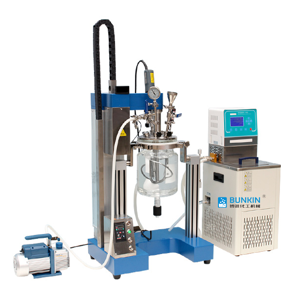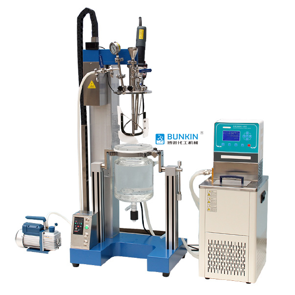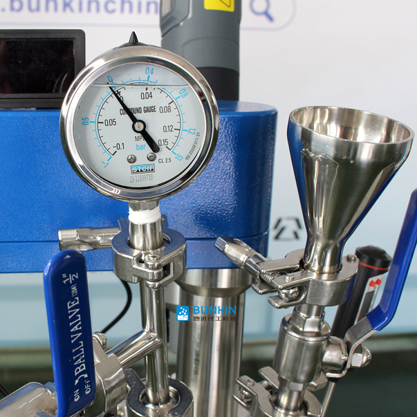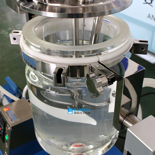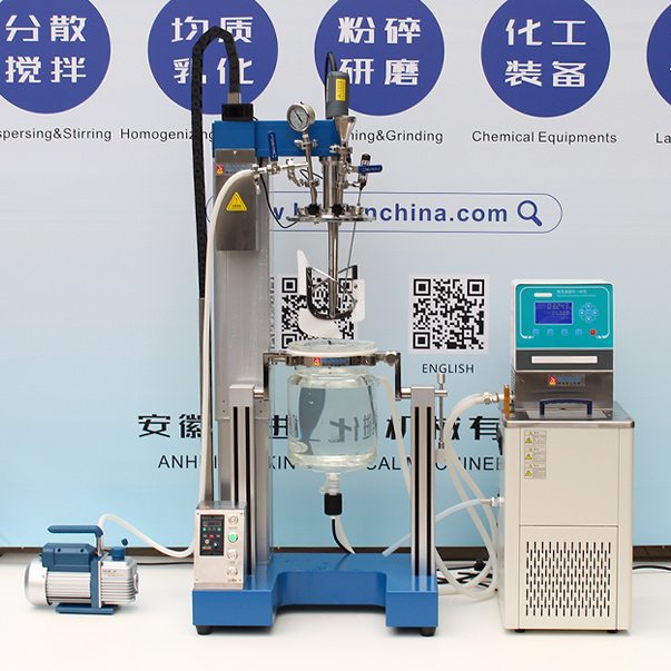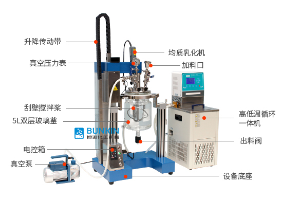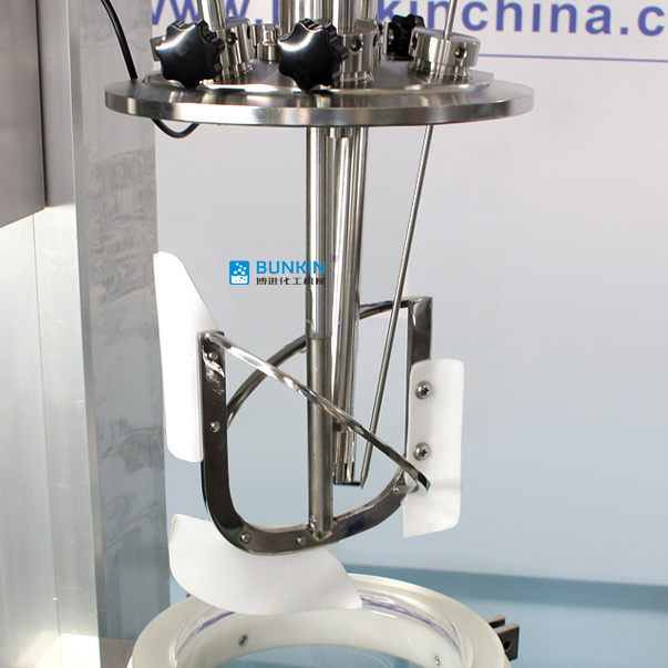 本機均質乳化裝置可直達釜底,可利用乳化頭內循環乳化。利用高速乳化裝置,由轉子高速旋轉帶 來高剪切力,使物料在定轉子狹窄的間隙中發生高頻剪切、擠壓、均質、撞擊等綜合作用,可使兩 相迅速融合,乳化,粒徑變窄,顆粒更均勻。搭配慢速刮邊的作用,刮壁板受到物料的阻力貼切在 釜壁作圓周運動,并將粘附在容器壁的物料推向容器中心區域,同時物料在攪拌槳的作用下完成宏 觀上的混合,使物料得到充分換熱和均勻混合。在攪拌物料的同時,通過夾層注入循環的熱溶液或 冷卻液,對釜內的物料進行恒溫的加熱或制冷。物料進行加熱反應時,在真空條件下可以提高蒸發效 率(需連接真空裝置),溶媒蒸汽經玻璃冷凝盤管時冷卻成液體(需連接冷卻裝置),可回流到釜內,也 可通過回流彎頭下部閥口進行回收。反應完畢,物料可從釜底的側出料口放出。
