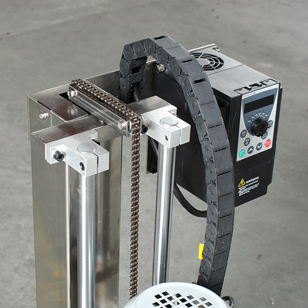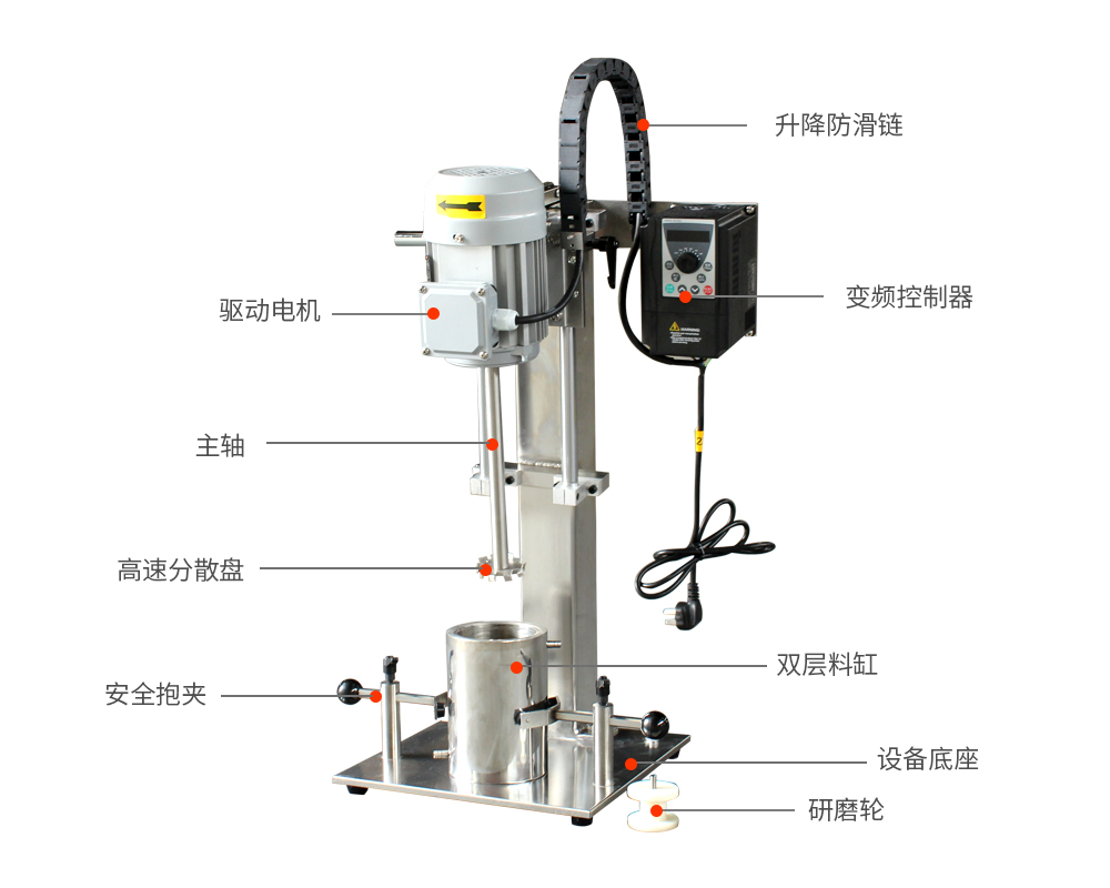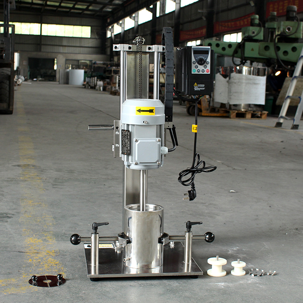 設備帶有鎖緊及升降手柄,能夠快速升降和固定;分散盤采用內六角螺栓與主軸固定,能夠方便快速拆卸更換,清洗容易;帶有夾桶裝置,可以快速將攪拌桶固定,防止桶在工作中發生位移造成安全事故。